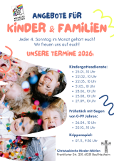 Immer am 2. Sonntag im Monat treffen sich um 09:30 Uhr Kinder im Alter von 3 bis 8 Jahren zur Kinderkirche im Albert-Schweitzer-Gemeindehaus in Ober-Mörlen. Mamas und Papas können die Kinder begleiten oder den dazu parallel stattfindenden Gottesdienst in der Kirche besuchen.