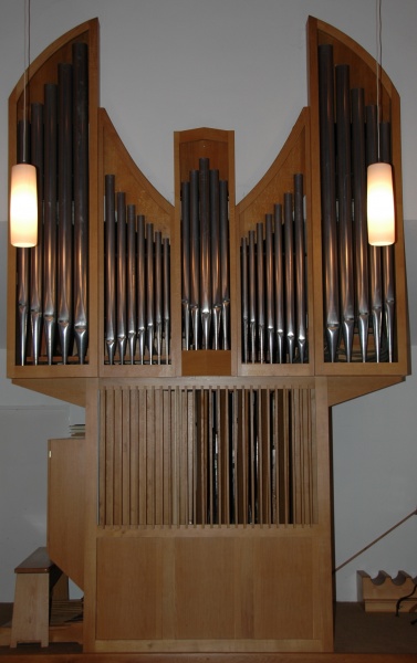 Das Orgelgehäuse wurde aus Eichenholz gefertigt. Der Prospekt ist dem Innenraum der Kirche optimal angepasst. 932 Metallpfeifen und 110 Holzpfeifen mussten auf verhältnismäßig kleinem Platz untergebracht werden. Die zweimanualige Orgel hat folgende Register: