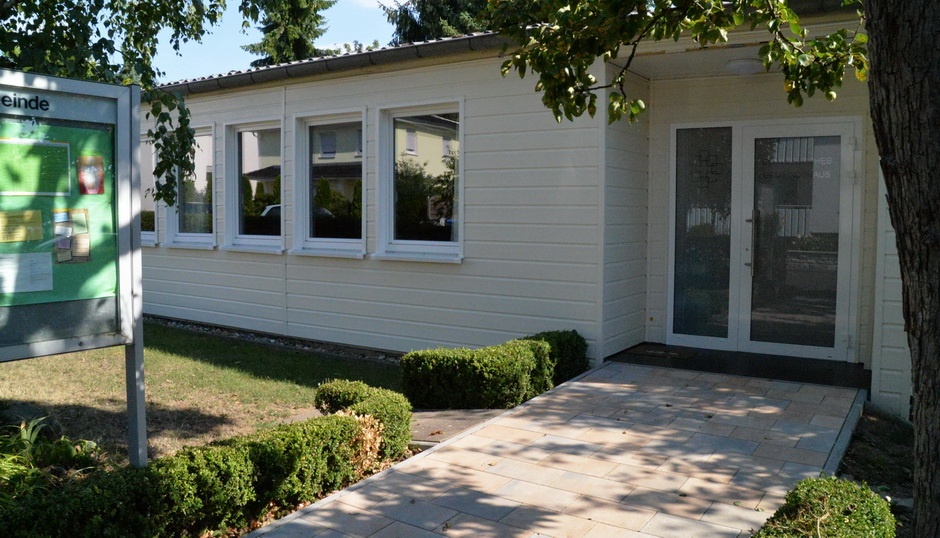 Nach etwa 300 m haben Sie das Gemeindehaus Schwalheim neben dem Parkplatz erreicht. Dort befinden sich auch Pfarramt und Pfarrhaus.